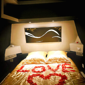 Nous proposons diverses options de personnalisation, notamment des décorations romantiques avec pétales de roses et bougies, ainsi que des repas gastronomiques, champagne, sushis, et des assiettes de macarons. Ces services sont disponibles sur demande pour créer une ambiance parfaite.